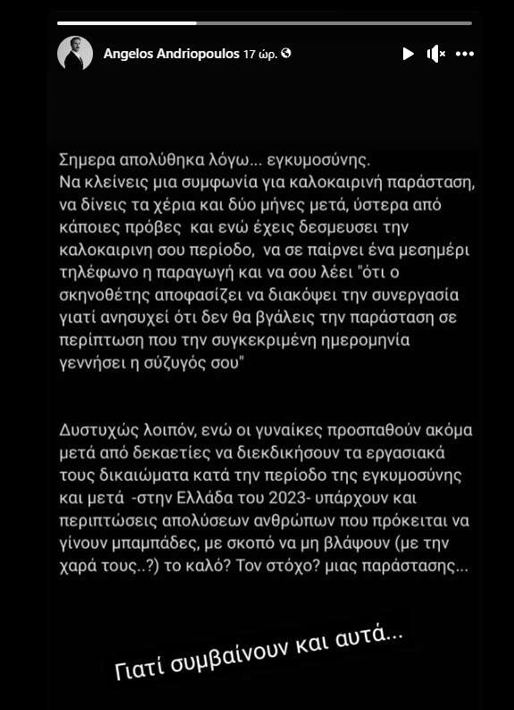 Δυστυχώς, λοιπόν, ενώ οι γυναίκες προσπαθούν ακόμα, μετά από δεκαετίες, να διεκδικήσουν τα εργασιακά τους δικαιώματα, κατά την περίοδο της εγκυμοσύνης και μετά -στην Ελλάδα του 2023- υπάρχουν και περιπτώσεις απολύσεων ανθρώπων που πρόκειται να γίνουν μπαμπάδες, με σκοπό να μη βλάψουν (με την χαρά τους…?) το καλό; Τον στόχο; μιας παράστασης…