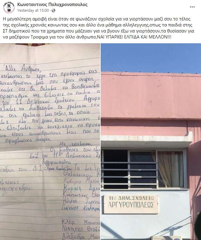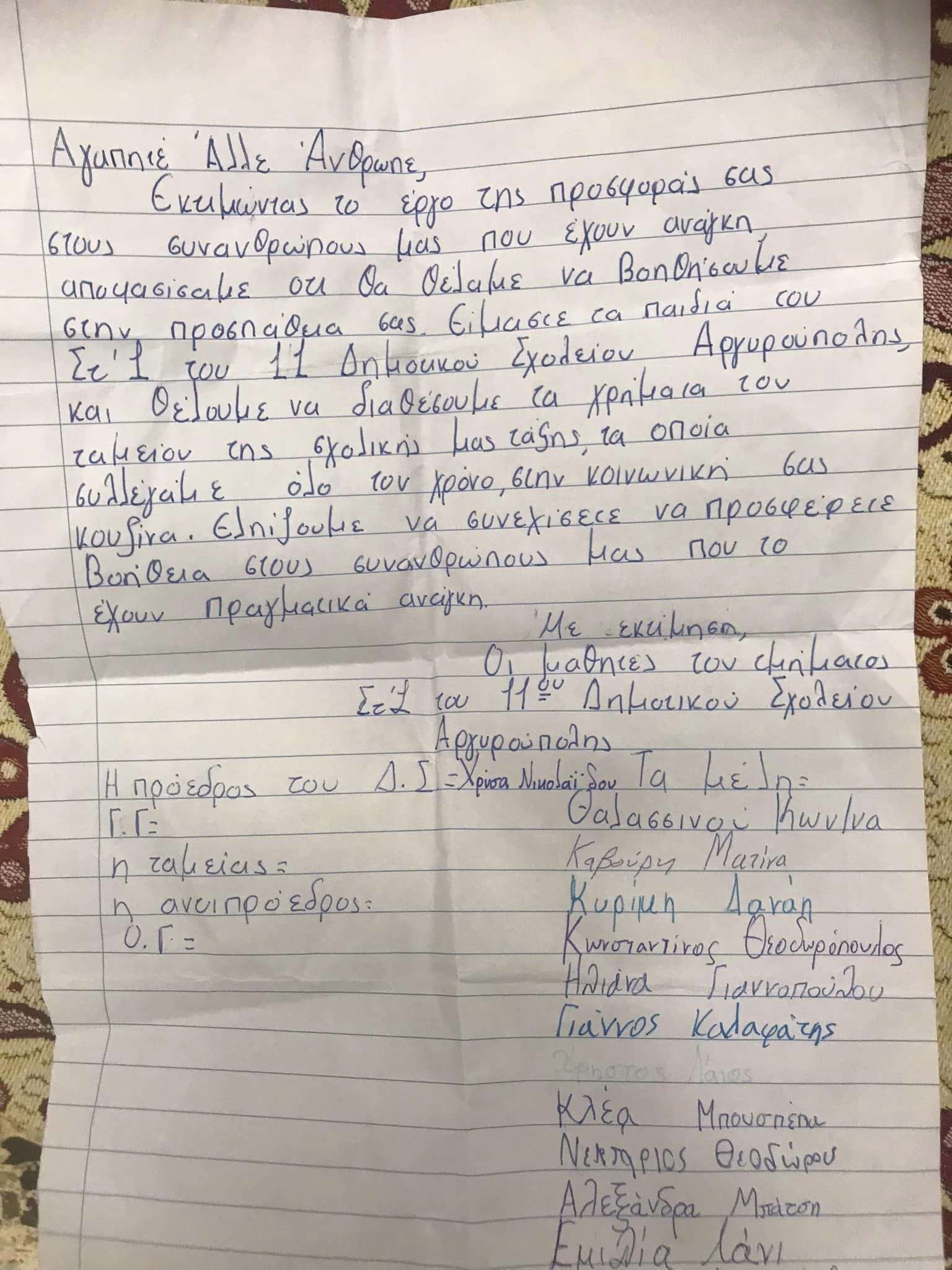 “Aγαπητέ Άλλε Άνθρωπε, Εκτιμώντας το έργο της προσφοράς σας στους συνανθρώπους μας που έχουν ανάγκη αποφασίσαμε ότι θα θέλαμε να βοηθήσουμε στην προσπάθειά σας. Είμαστε τα παιδιά του Στ1 του 11 Δημοτικού Σχολείου Αργυρούπολης, και θέλουμε να διαθέσουμε τα χρήματα του ταμείου της σχολικής μας τάξης, τα οποία συλλέγαμε όλο τον χρόνο, στην κοινωνική σας κουζίνα. Ελπίζουμε να συνεχίσετε να προσφέρετε βοήθεια στους συνανθρώπους μας που το έχουν πραγματικά ανάγκη”.