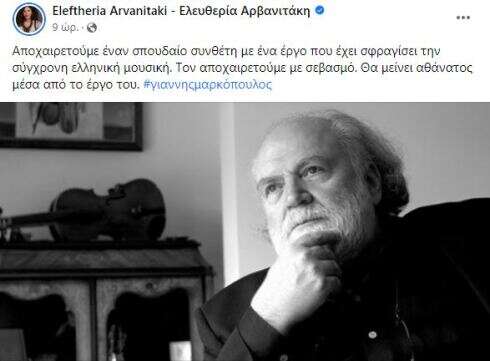 Μήνυμα για τον θάνατο του Γιάννη Μαρκόπουλου έστειλε και η Ελευθερία Αρβανιτάκη. «Αποχαιρετούμε έναν σπουδαίο συνθέτη που έχει αφήσει ένα τεράστιο αποτύπωμα στην ελληνική μουσική. Τον αποχαιρετούμε με μεγάλο σεβασμό. Θα μείνει αθάνατος μέσα από το έργο του. #γιαννης μαρκόπουλος», έγραψε στο Twitter.