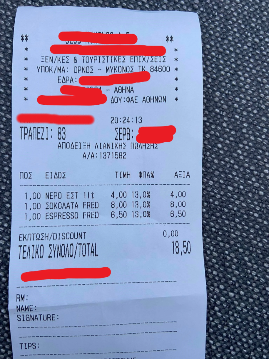 Πόσο πιστεύετε κοστίζει ένα μπουκάλι νερό, ένας freddo espresso και ένα ρόφημα σοκολάτας στην περιοχή του Ορνού; Οι συγκεκριμένοι πελάτες πλήρωσαν 18,50 ευρώ, σύμφωνα με την απόδειξη που δημοσίευσε το syrospress.gr. Όπως ήταν αναμενόμενο, οι πελάτες έφυγαν εξοργισμένοι.