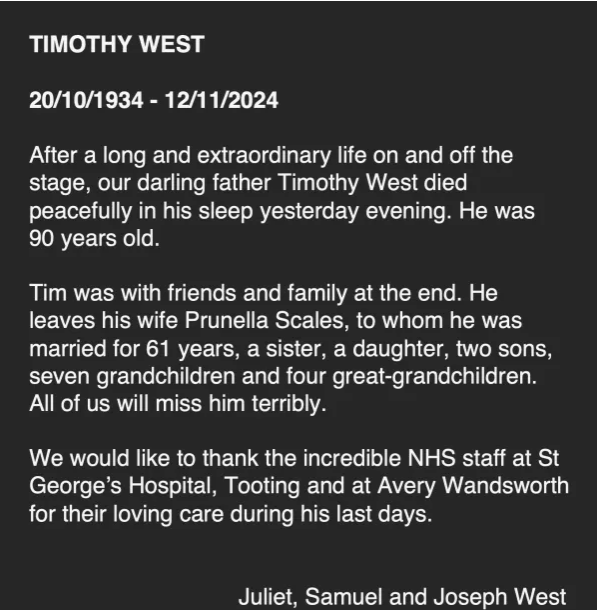 His children Juliet, Samuel and Joseph West said: “After a long and extraordinary life on and off the stage, our darling father Timothy West died peacefully in his sleep yesterday evening.