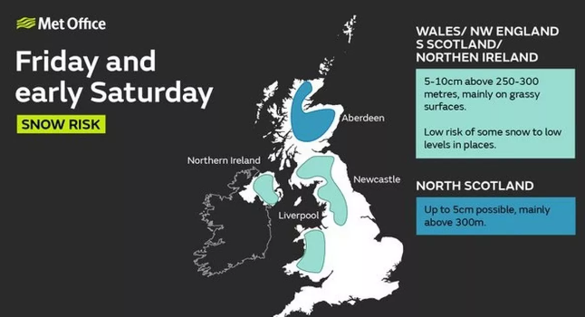 It means that north west England and parts of Wales, as well as Northern Ireland and southern Scotland could receive up to 10 centimetres on Friday and Saturday. An area of central and northern Scotland is also likely to see some snow up to five centimetres.
