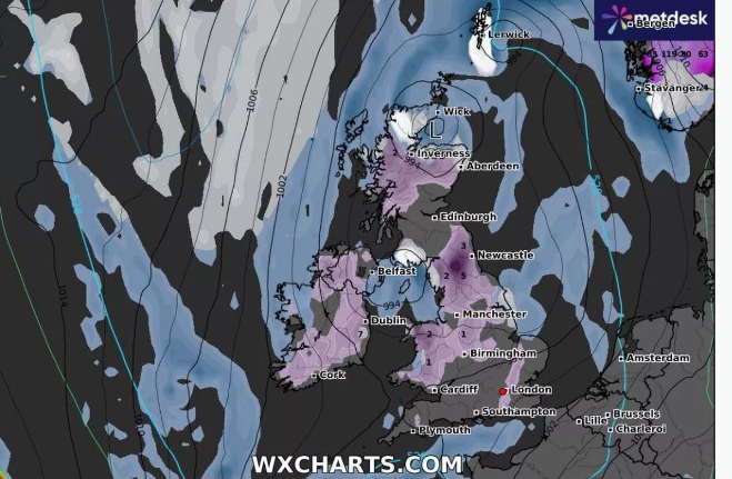 Maps from WXCharts show the snow moving in on Friday with most of the snow landing in Wales that could see five centimetres in the north while there could also be a couple of centimetres in the north west of England including Manchester. By Friday night and into Saturday, there will be more widespread snow across northern England including around five centimetres in the Newcastle area.
