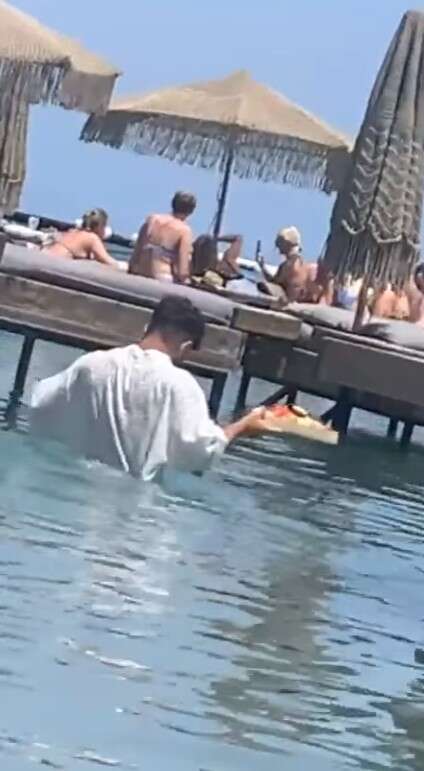 Όπως φαίνεται, ο σερβιτόρος κρατώντας τον δίσκο με τα φαγητά μπαίνει στη θάλασσα, με το νερό να φτάνει περίπου έως τον λαιμό ώστε να παραδώσει την παραγγελία στους λουόμενους, οι οποίοι βρίσκονται πάνω σε ξύλινη πλατφόρμα.