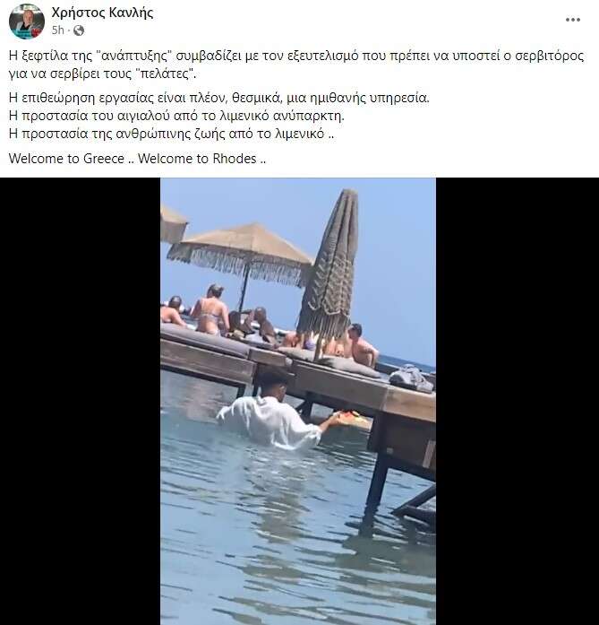 Τις τελευταίες ώρες τον γύρο του διαδικτύου κάνουν οι φωτογραφίες από γνωστό beach bar στην Καλλιθέα της Ρόδου. Σε αυτό το μαγαζί, οι σερβιτόροι είναι υποχρεωμένοι σχεδόν να κολυμπούν για εξυπηρετήσουν τους πελάτες, μια πρακτική που θα την χαρακτήριζε κάποιος απάνθρωπη.