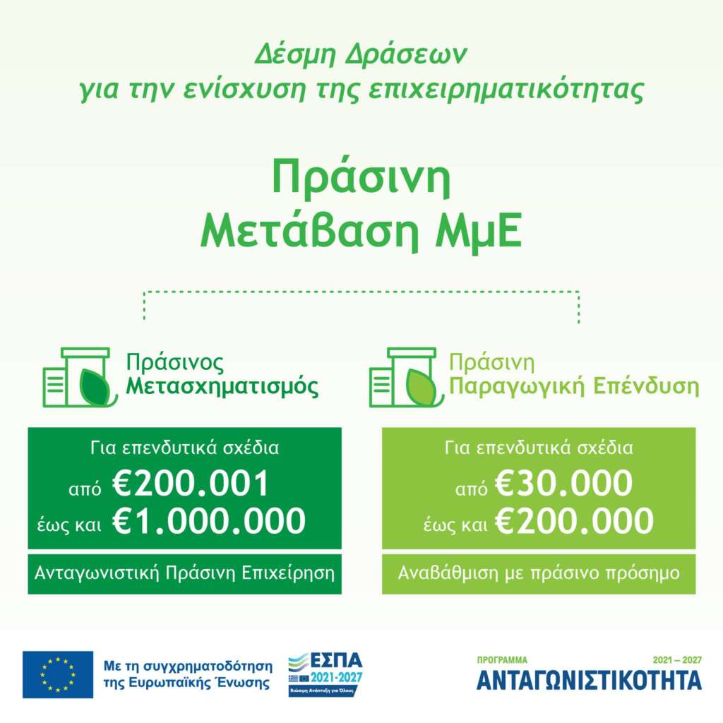 Πιο συγκεκριμένα η «Πράσινη Μετάβαση ΜμΕ» ενθαρρύνει επενδυτικά σχέδια που στοχεύουν στην αξιοποίηση και ανάπτυξη συγχρόνων τεχνολογιών, στην αναβάθμιση των παραγόμενων προϊόντων ή/και παρεχόμενων υπηρεσιών και εν γένει δραστηριοτήτων τους, πριμοδοτώντας ενέργειες οι οποίες αξιοποιούν σύγχρονες τεχνολογίες, υποδομές και βέλτιστες πρακτικές σε θέματα ενεργειακής αναβάθμισης και κυκλικής οικονομίας.