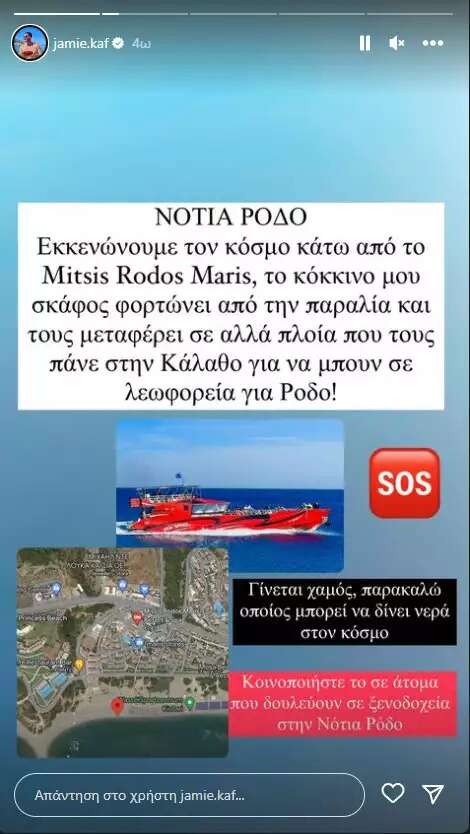 Με αναρτήσεις στα social media, ο πρώην παίκτης του Survivor ενημέρωσε: «Εκκενώνουμε τον κόσμο κάτω από το Mitsis Rodos Maris, το κόκκινό μου σκάφος φορτώνει από την παραλία και τους μεταφέρει σε άλλα πλοία που τους πάνε στην Κάλαθο για να μπουν σε λεωφορεία για Ρόδο».