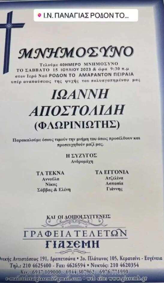 Κατά τη δημοσίευσή της, το 40ήμερο μνημόσυνο θα πραγματοποιηθεί στις 9.30 το πρωί, στον Ιερό Ναό Ρόδον το Αμάραντον Πειραιά.