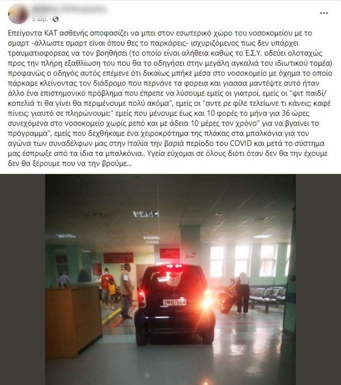 Το περιστατικό έγινε πριν τρεις εβδομάδες και η φωτογραφία με το smart στο νοσoκομείο κάνει τον γύρο του διαδικτύου.
