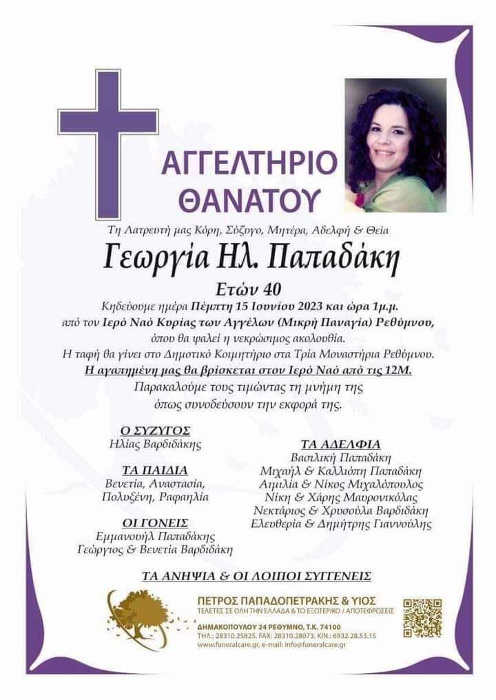 Την τελευταία της πνοή άφησε η Γεωργία Παπαδάκη από το Ρέθυμνο, η οποία πέθανε σε ηλικία 40 ετών, βυθίζοντας στο πένθος την οικογένεια της. Η άτυχη γυναίκα άφησε την τελευταία της πνοή, μετά από σκληρή μάχη που έδωσε για να κρατηθεί στη ζωή, τους τελευταίους μήνες, αφήνοντας πίσω τον σύζυγο της, Ηλία Βαρδιδάκη και τις τέσσερις κόρες της, οι οποίοι είναι απαρηγόρητοι.