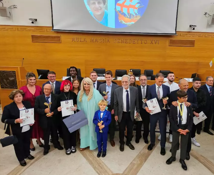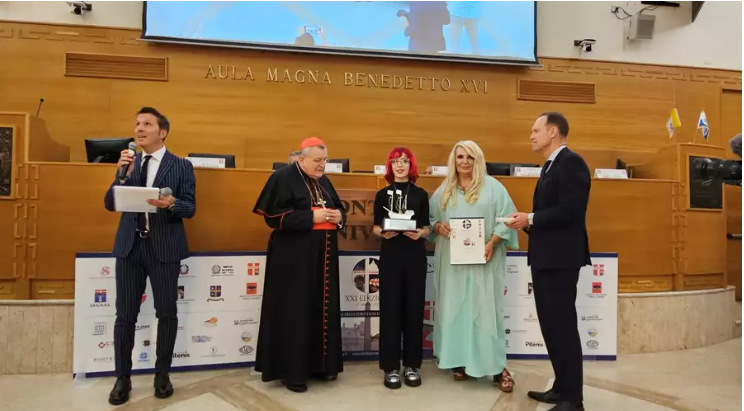 Η Αυτού Εξοχότης Πρέσβυς της Ελλάδας στο Βατικανό Κάτια Γεωργίου και ο Δρ. Επικοινωνίας Andrea Cicini βράβευσαν τον Ανδρέα Αλικανιώτη 20 ετών και τον Άγγελο Τσιαμούρα 19 ετών με το βραβείο Εθελοντισμού και Κοινωνικής Αλληλεγγύης σε μια φορτισμένη ατμόσφαιρα με το κοινό να χειροκροτεί όρθιο τους δύο ήρωες των Τεμπών.