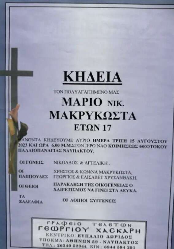 Ανήμερα της Παναγίας αλλά και της ονομαστικής του εορτής, η Ναυπακτία θα πει το τελευταίο αντίο στον άτυχο Μάριο Μακρυκώστα.