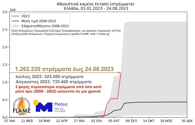 🔥Η έκταση που έχει καεί έως την Τετάρτη 23.08.2023 αντιστοιχεί σε περίπου 3 φορές την έκταση που κατά μέσο όρο (2006 – 2022) καίγεται ετησίως στη χώρα μας.