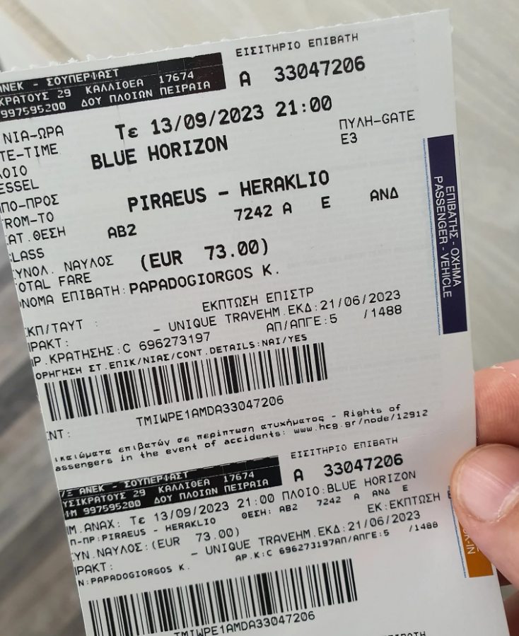 Στις 21/6 μέσω ταξιδιωτικού γραφείου, φίλου κ συνεργάτη χρόνια, έκλεισα εισιτήρια για επαγγελματικό ταξίδι στη Κρήτη (που το συνδύασα κ με ψυχαγωγία) με το πλοίο #BlueHorizon για τις 13/9.