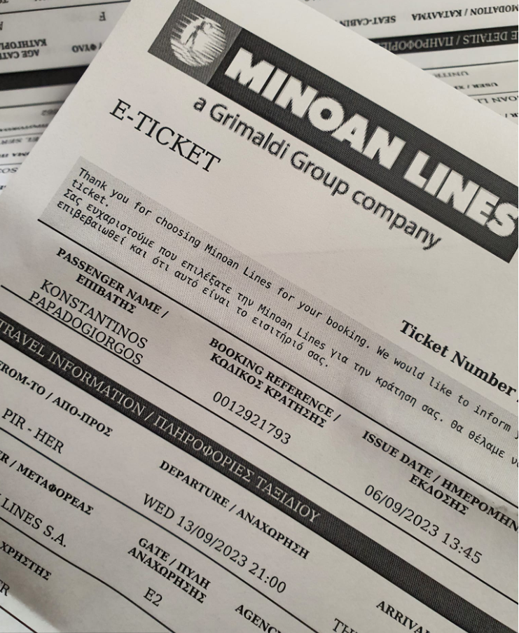 Πιο αναλυτικά όπως αναφέρει στην ανάρτηση του στον προσωπικό του λογαριασμό στο facebook ο Κώστας Παπαδογιώργος, στις 21 Ιουνίου έκλεισε εισιτήρια για επαγγελματικό ταξίδι στη Κρήτη. Το ταξίδι επρόκειτο να πραγματοποιηθεί στις 13 Σεπτεμβρίου με το πλοίο Blue Horizon.