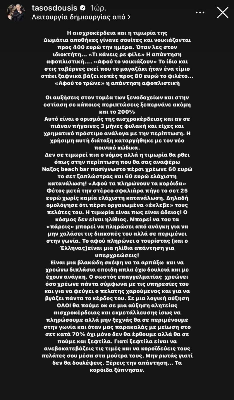 O τουρισμός καταρρέει σε δημοφιλείς προορισμούς (δείτε εδώ) και ο Τάσος Δούσης, με νέο ξέσπαμα στην σελίδα του στο Instagram, αποκαλύπτει τις πραγματικές αιτίες. Για τις αυξήσεις σε ξενοδοχεία και εστίαση που σε κάποιες περιπτώσεις ξεπέρασε και το 200% αλλά και για αποθήκες που… νοικιάζονται για 400 ευρώ!