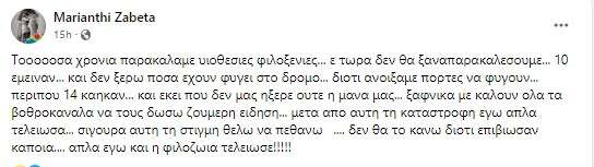 Μάλιστα, η υπεύθυνη του καταφυγίου προχώρησε σε μία φορτισμένη ανάρτηση στο Facebook, γράφοντας: «Τοοοοοσα χρόνια παρακαλάμε υιοθεσίες φιλοξενίες ε τώρα δεν θα ξαναπαρακαλέσουμε… 10 έμειναν και δεν ξέρω πόσα έχουν φύγει στο δρόμο διότι ανοίξαμε πόρτες να φύγουν περίπου 14 κάηκαν και εκεί που δεν μας ήξερε ούτε η μάνα μας… ξαφνικά με καλούν όλα τα βοθροκαναλα να τους δώσω ζουμερή είδηση μετά από αυτή την καταστροφή εγώ απλά τελείωσα σίγουρα αυτή τη στιγμή θέλω να πεθάνω …. δεν θα το κάνω διότι επιβίωσαν κάποια.. Απλά εγώ και η φιλοζωία τελείωσε!!!!!».
