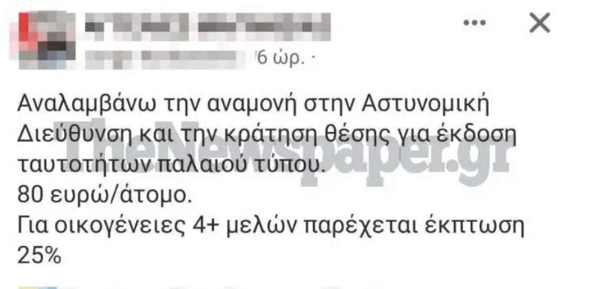 «Αναλαμβάνω την αναμονή στην Αστυνομική Διεύθυνση και την κράτηση θέσης για έκδοση ταυτοτήτων παλαιού τύπου. 80 ευρώ / άτομο. Για οικογένειες 4+ μελών παρέχεται έκπτωση 25%» ήταν το περιεχόμενο της αγγελίας, όπως αναφέρει το thenewspaper.gr.