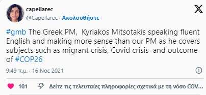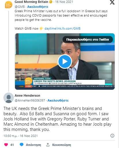 Αυτή δεν είναι η πρώτη φορά που ο Κυριάκος Μητσοτάκης θα εμφανιστεί στην εκπομπή του βρετανικού τηλεοπτικού δικτύου, αν και μέσω σύνδεσης αυτή τη φορά, καθώς είχε μιλήσει και τον Νοέμβριο του 2021, οπότε και είχε γίνει viral στη Μεγάλη Βρετανία, και τρένταρε και στο βρετανικό τουήτερ, με τους Άγγλους να ζητούν να αναλάβει τη χώρα εκέινος αντί του Μπόρις Τζόνσον, ο οποίος ήταν τότε πρωθυπουργός.