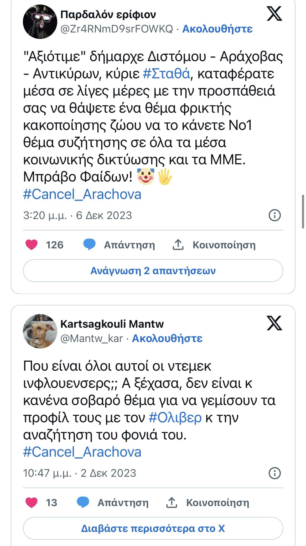 Στο πλαίσιο αυτό, έχει δημιουργηθεί το hashtag “cancel arachova”, με τον χειμερινό προορισμό να γίνεται trend στο Twitter, καθώς εκεί ο Όλιβερ βρήκε μαρτυρικό θάνατο από αιμορραγία αφότου βιάστηκε με αιχμηρό αντικείμενο.