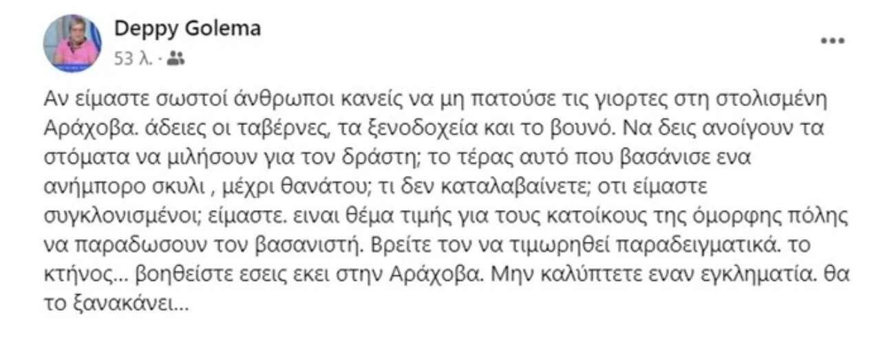 “Αν είμαστε σωστοί άνθρωποι κανείς να μη πατούσε τις γιορτες στη στολισμένη Αράχοβα. άδειες οι ταβέρνες, τα ξενοδοχεία και το βουνό. Να δεις ανοίγουν τα στόματα να μιλήσουν για τον δράστη; το τέρας αυτό που βασάνισε ενα ανήμπορο σκυλι, μέχρι θανάτου; τι δεν καταλαβαίνετε; οτι είμαστε συγκλονισμένοι; είμαστε. ειναι θέμα τιμής για τους κατοίκους της όμορφης πόλης να παραδωσουν τον βασανιστή. Βρείτε τον να τιμωρηθεί παραδειγματικά. το κτήνος… βοηθείστε εσεις εκει στην Αράχοβα. Μην καλύπτετε εναν εγκληματία. θα το ξανακάνει…” έγραψε η τηλεκριτικός.