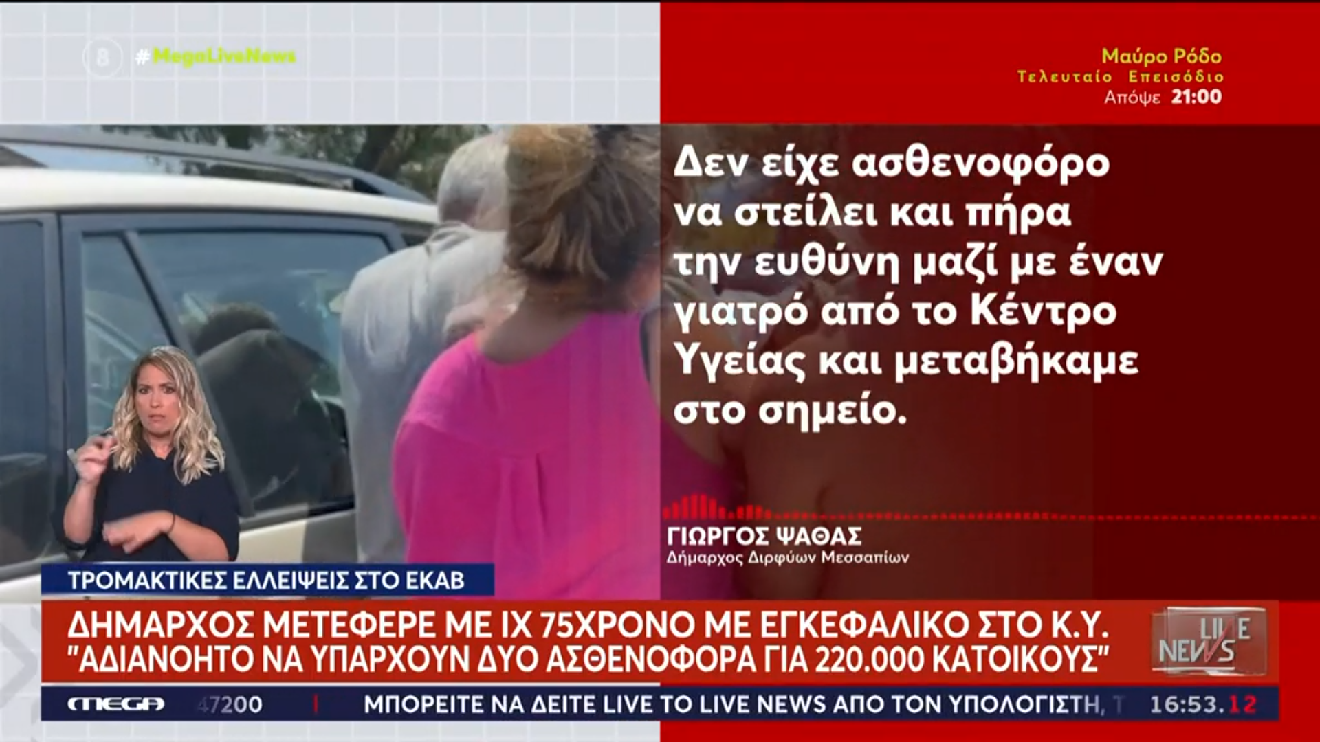 Αυτή τη φορά πρόκειται για επείγον περιστατικό στην παραλία του Λιμνιώνα, όπου ο δήμαρχος Διρφύων Μεσσαπίων Γιώργος Ψαθάς αναγκάστηκε να μεταφέρει ο ίδιος τον παλαίμαχο τερματοφύλακα του Πανιωνίου Ζαφείρη Κάκαρη, με πρόβλημα υγείας, στο κέντρο υγείας Ψαχνών, μαζί με γιατρό της περιοχής. Ο δήμαρχος μαζί με κατοίκους τον έβαλαν στο δικό τους αμάξι για να τον μεταφέρουν στο νοσοκομείο. Αφού τα μόλις 2 ασθενοφόρα της περιοχής ήταν απασχολημένα.