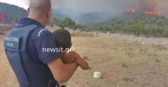 Μάνδρα: Το viral στιγμιότυπο με αστυνομικό να απομακρύνει παιδί από την φωτιά