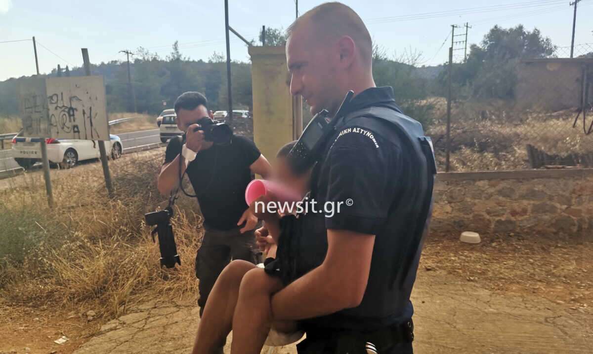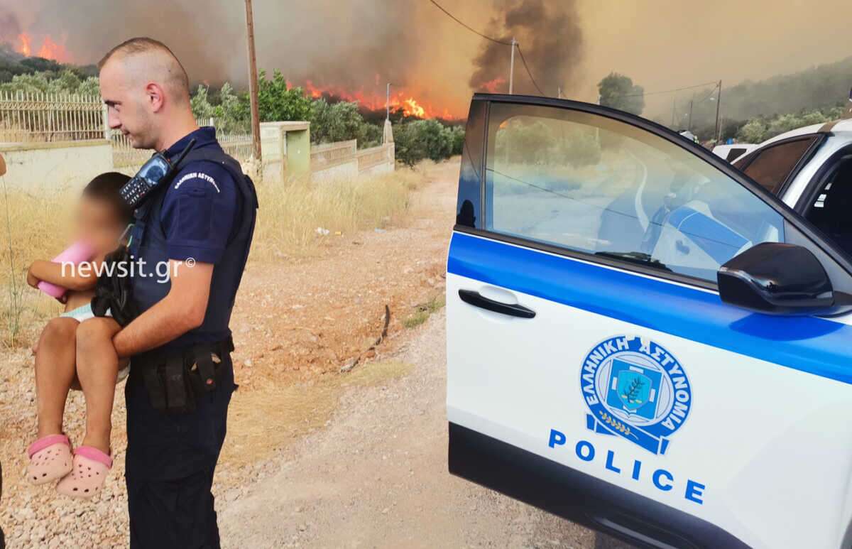 Μάνδρα: Το viral στιγμιότυπο με αστυνομικό να απομακρύνει παιδί από την φωτιά