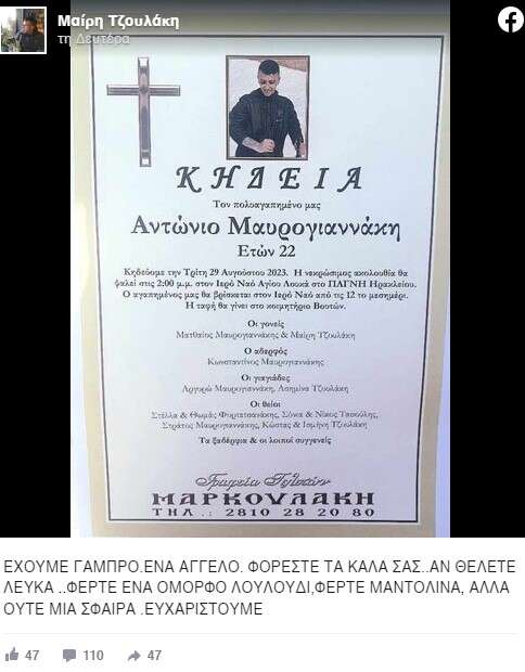 Ανείπωτος ήταν ο θρήνος στην κηδεία του 22χρονου Αντώνη Μαυρογιαννάκη. Ο αδικοχαμένος νεαρός άφησε την τελευταία του πνοή στο Πανεπιστημιακό Νοσοκομείο Ηρακλείου μετά από τροχαίο.