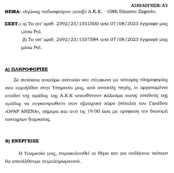 Στο δεύτερο έγγραφο επισημαίνεται πως «σύμφωνα με νεότερες πληροφορίες που περιήλθαν στην Υπηρεσία μας, οι οργανωμένοι οπαδοί της ομάδας της Α.Ε.Κ έχουν πληροφορηθεί για την έλευση των οπαδών της ομάδας της Ντινάμο Ζάγκρεμπ, γεγονός που έχει προκαλέσει αναβρασμό στις τάξεις τους και συζητούν για δικές τους ενέργειες».