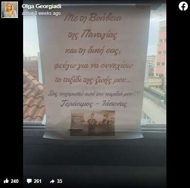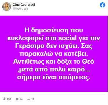 Η δημοσίευση που κυκλοφορεί στα social για τον Γεράσιμο δεν ισχύει. Σας παρακαλώ να κατέβει. Αντιθέτως και δόξα το Θεό ,μετά από πολύ καιρό… σήμερα είναι απύρετος.