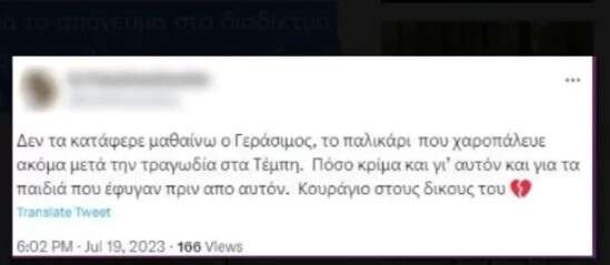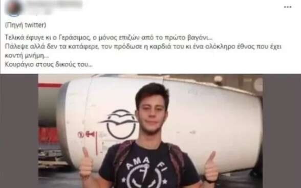 Τον γύρο του διαδικτύου φαίνεται να έχουν κάνει ορισμένα δημοσιεύματα που θέλουν τον 20χρονο Γεράσιμο, τον μοναδικό επιζώντα του πρώτου βαγονιού, να έχει αφήσει την τελευταία του πνοή. Η θεία του 20χρονου που επέζησε διέψευσε την είδηση και δήλωσε με ανάρτηση της στο facebook ότι η υγεία του είναι καλύτερα και δεν έχει πυρετό
