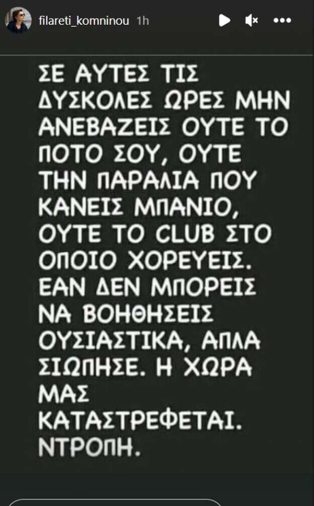“Σε αυτές τις δύσκολες ώρες μην ανεβάζεις ούτε το ποτό σου, ούτε την παραλία που κάνεις μπάνιο, ούτε το club στο οποίο χορεύεις. Εάν δε μπορείς να βοηθήσεις ουσιαστικά, απλά σιώπησε. Η χώρα μας καταστρέφεται. Ντροπή” έγραψε στην ανάρτησή της η Φιλαρέτη Κομνηνού.
