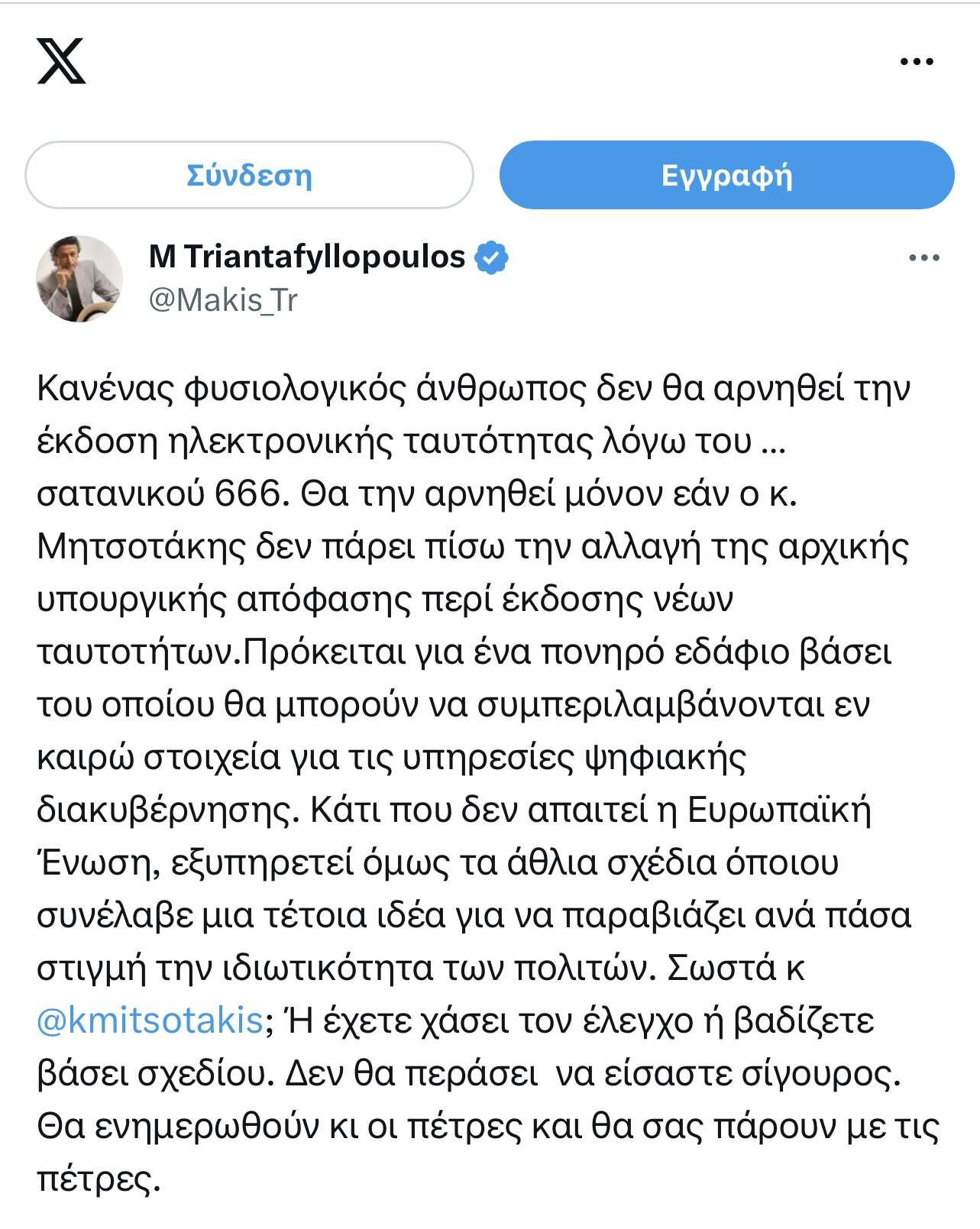 Κανένας φυσιολογικός άνθρωπος δεν θα αρνηθεί την έκδοση ηλεκτρονικής ταυτότητας λόγω του …σατανικού 666. Θα την αρνηθεί μόνον εάν ο κ. Μητσοτάκης δεν πάρει πίσω την αλλαγή της αρχικής υπουργικής απόφασης περί έκδοσης νέων ταυτοτήτων. Πρόκειται για ένα πονηρό εδάφιο βάσει του οποίου θα μπορούν να συμπεριλαμβάνονται εν καιρώ στοιχεία για τις υπηρεσίες ψηφιακής διακυβέρνησης. Κάτι που δεν απαιτεί η Ευρωπαϊκή Ένωση, εξυπηρετεί όμως τα άθλια σχέδια όποιου συνέλαβε μια τέτοια ιδέα για να παραβιάζει ανά πάσα στιγμή την ιδιωτικότητα των πολιτών. Σωστά; Ή έχετε χάσει τον έλεγχο ή βαδίζετε βάσει σχεδίου. Δεν θα περάσει να είσαστε σίγουρος. Θα ενημερωθούν κι οι πέτρες και θα σας πάρουν με τις πέτρες.