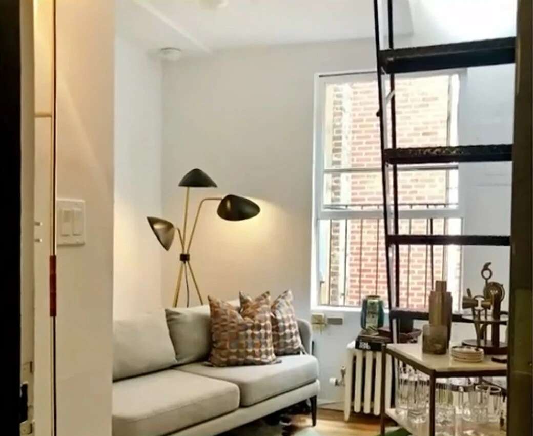 Το μικροσκοπικό διαμέρισμα των μόλις στο West Village της Νέας Υόρκης είναι γεμάτο από έξυπνες ιδέες αξιοποίησης κάθε εκατοστού, όπως ένα σκαμνάκι κομοδίνο δίπλα στο κρεβάτι.