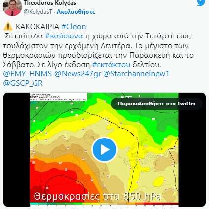 Η Εθνική Μετεωρολογική Υπηρεσία (ΕΜΥ), εξέδωσε έκτακτο δελτίο επιδείνωσης καιρού για τον επερχόμενο καύσωνα Κλέων. Ο υδράργυρος σταδιακά θα ξεπεράσει τους 40 βαθμούς Κελσίου, με τις ανώτατες τιμές να αναμένονται -σύμφωνα με τα έως τώρα προγνωστικά- το επόμενο σαββατοκύριακο, όπου ο υδράργυρος προβλέπεται να φτάσει ακόμη και πάνω από τους 43 βαθμούς τοπικά στα ηπειρωτικά της χώρας.
