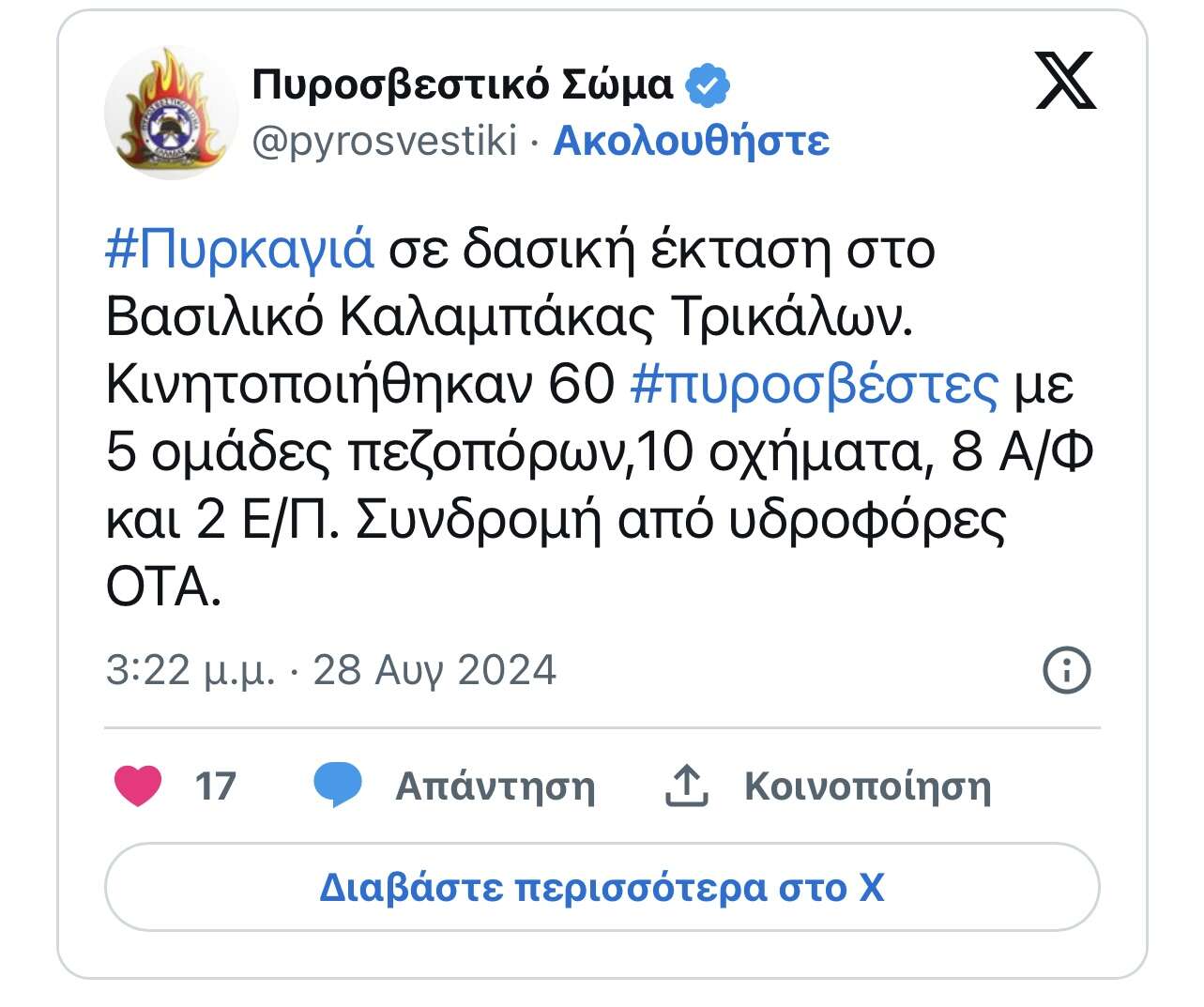 Φωτιά ξέσπασε το μεσημέρι της Τετάρτης (28/8) σε δασική έκταση στο Βασιλικό Καλαμπάκας Τρικάλων.