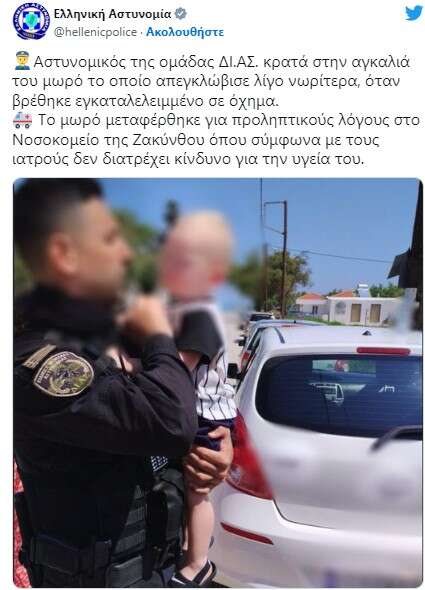 Μετά τον απεγκλωβισμό του παιδιού, αστυνομικός της ομάδας ΔΙΑΣ το πήρε στην αγκαλιά του μέχρι το παιδί να μεταφερθεί με ασθενοφόρο του ΕΚΑΒ στο νοσοκομείο της Ζακύνθου για προληπτικούς λόγους.