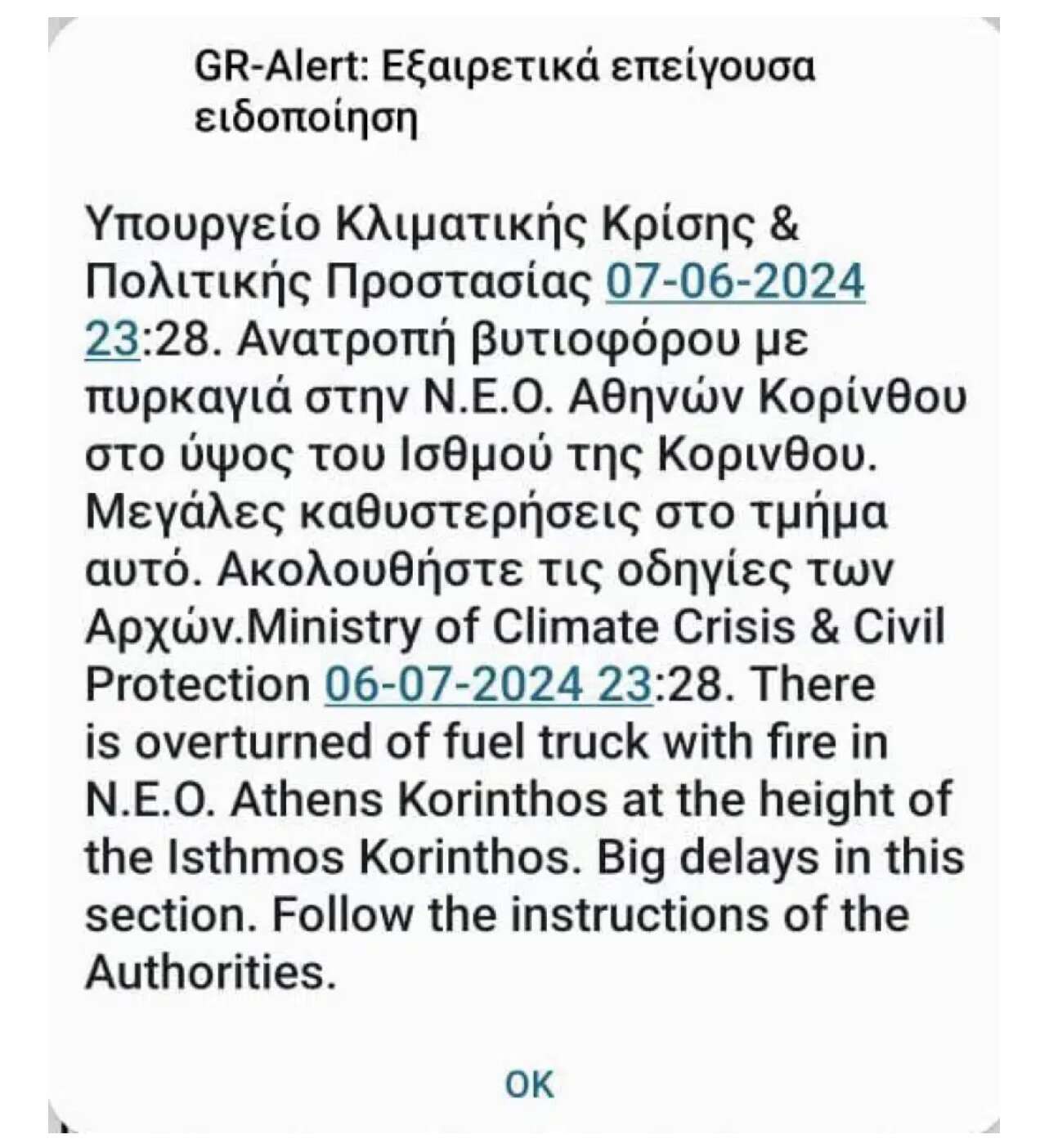 Για το λόγο αυτό εκδόθηκε και είναι ακόμη σε ισχύ 112 για απαγόρευση εισοδου στην Ολυμπία οδό από Ελευσίνα προς Κόρινθο και από Κιάτο προς Κόρινθο, όσο εξετάζεται η κατάσταση της αερογέφυρας (από την οποία περνά η παλαιά Εθνικη Οδός) από τους μηχανικούς.