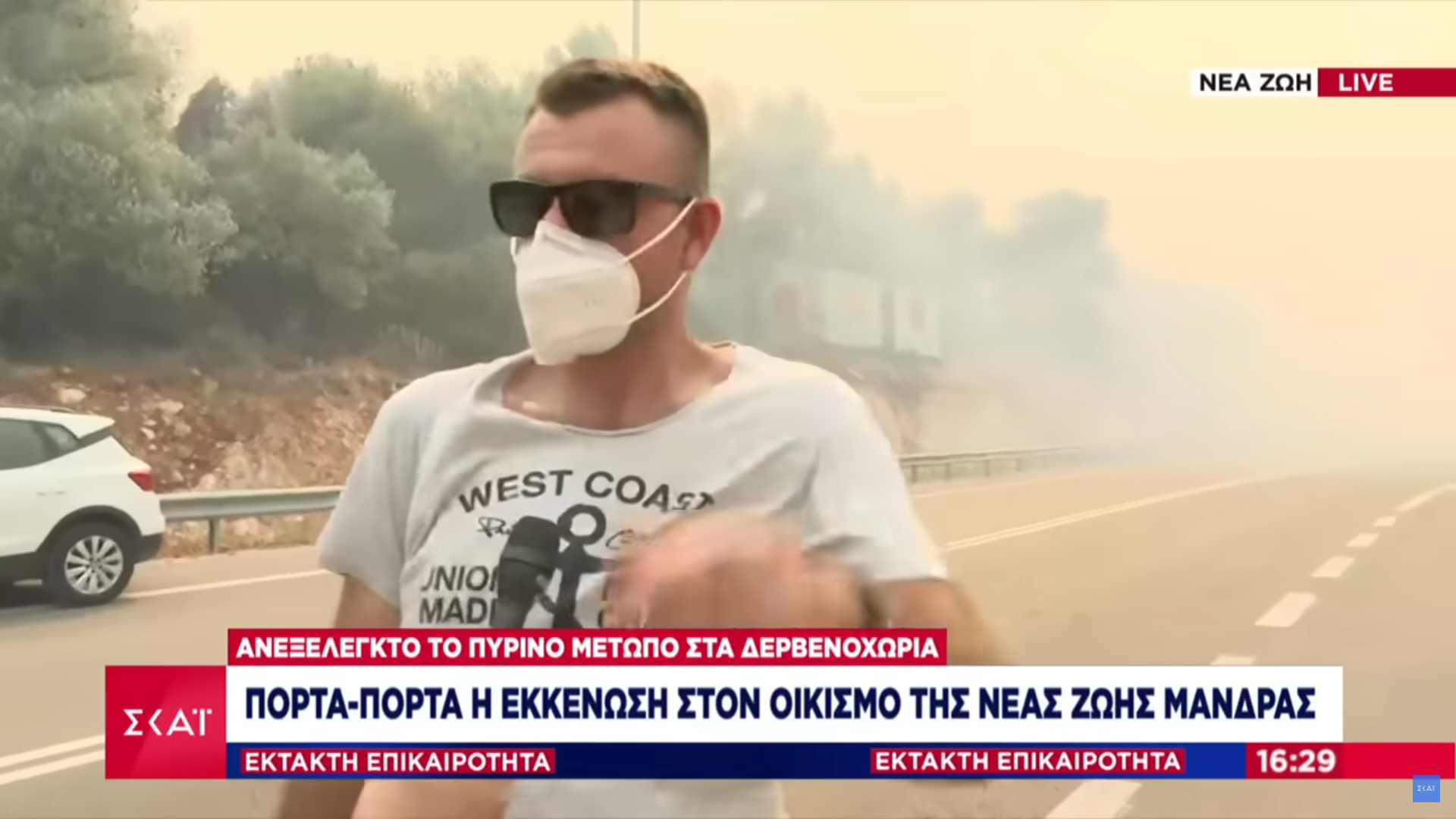 Ο ρεπόρτερ του ΣΚΑΙ είπε on air ότι όση ώρα βρισκόταν σε συγκεκριμένο σημείο στη Νέα Ζωή Μάνδρας δεν είδε ούτε έναν πυροσβέστη. «Έχουν απομακρυνθεί οι υδροφόρες, μείναμε τα τηλεοπτικά συνεργεία και κάποιοι κάτοικοι που βλέπουν τα όσα εξελίσσονται» είπε ο Μιχάλης Τεζάρης.