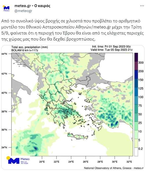 Σύμφωνα με σε ανάρτησή του Meteo: «Από το συνολικό ύψος βροχής σε χιλιοστά που προβλέπει το αριθμητικό μοντέλο του Εθνικού Αστεροσκοπείου Αθηνών/meteo.gr μέχρι την Τρίτη 5/9, φαίνεται ότι η περιοχή του Έβρου θα είναι από τις ελάχιστες περιοχές της χώρας μας που δεν θα δεχθεί βροχοπτώσεις».