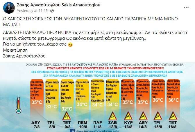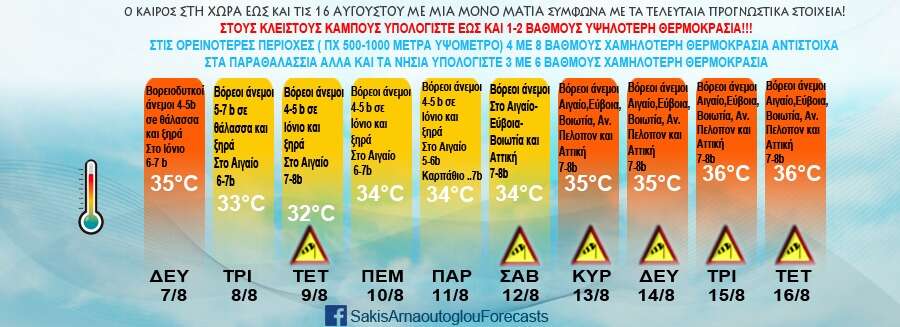 Σύμφωνα με τον Σάκη Αρναούτογλου, μέσω ανάρτησής του στο Facebook, ο καιρός θα είναι καλός όλη την τρέχουσα εβδομάδα, ενώ κανονικές θερμοκρασίες θα επικρατήσουν τον Δεκαπενταύγουστο, με το θερμόμετρο να φτάνει τους 36 βαθμούς Κελσίου.
