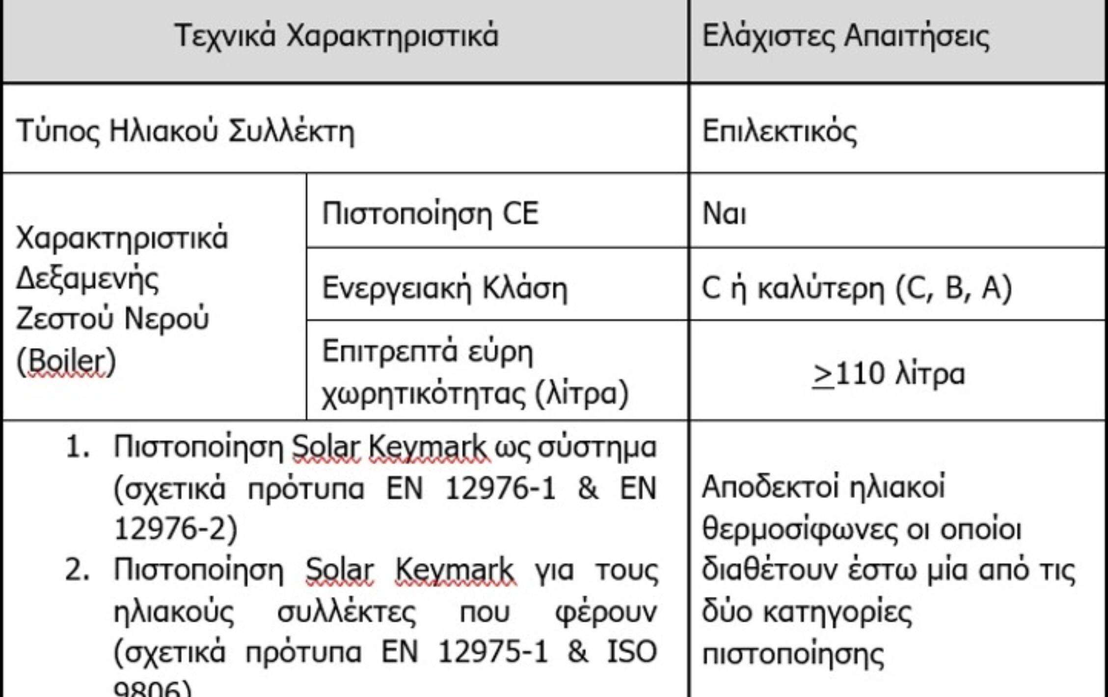 Το πρόγραμμα, σύμφωνα με το newsique.gr επιχορηγεί την αγορά ηλιακών θερμοσιφώνων με τα ακόλουθα χαρακτηριστικά: