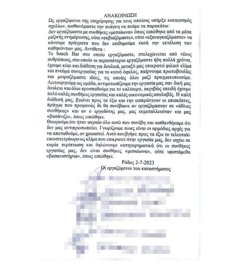 Τη δική τους απάντηση στα όσα λέγονται τις τελευταίες ώρες θέλησαν να δώσουν οι εργαζόμενοι του beach bar στη Ρόδο καθώς, σύμφωνα με την ανακοίνωση τους, όσα λέγονται από τα ΜΜΕ δεν ευσταθούν. Μάλιστα, στην ανακοίνωση που έβγαλαν τονίζουν ότι : «Δεν εργαζόμαστε με «συνθήκες μεσαίωνα» όπως ειπώθηκε από μέσα μαζικής ενημέρωσης ούτε «εκβιαζόμαστε» ούτε «εξαναγκαζόμαστε» .