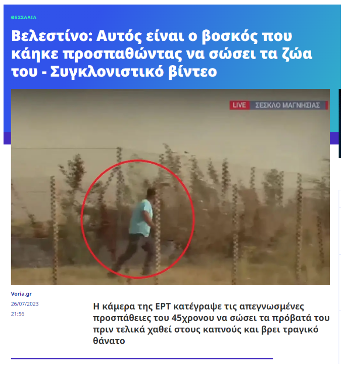 Κρίνουμε σκόπιμο να αναφέρουμε ότι δεν είναι σαφές αν η δημοσιογράφος αναφέρεται στα πλάνα από το Σέσκλο. Σε κάθε περίπτωση, όμως, ηλεκτρονικά μέσα που πράγματι ανέτρεξαν στις συνδέσεις της δημοσιογράφου, συνέδεσαν εσφαλμένα το βιντεοληπτικό υλικό με τον άνδρα με το τιρκουάζ μπλουζάκι που επιχειρεί να σώσει ένα κοπάδι πρόβατα, με το θάνατο του 45χρονου βοσκού, καταλήγοντας πως ο εικονιζόμενος είναι ο βοσκός που κάηκε προσπαθώντας να σώσει τα ζώα του.
