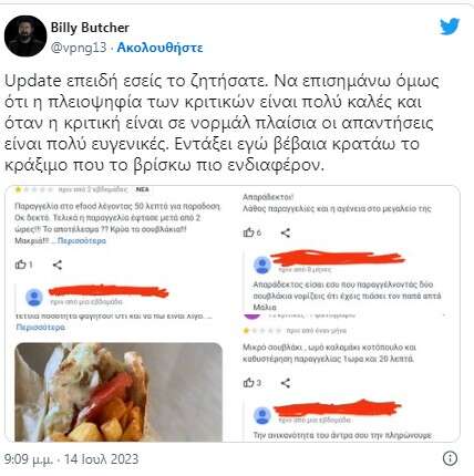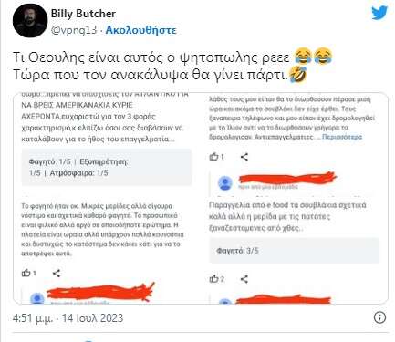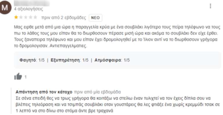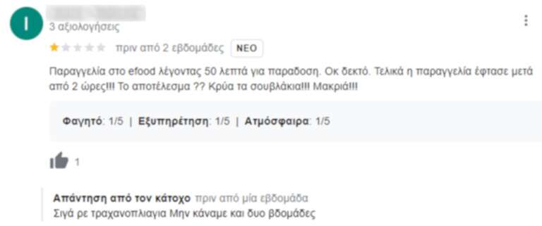 Viral έχει καταφέρει να γίνει ο ιδιοκτήτης μιας ταβέρνας, ο οποίος «δικάζει» τις κριτικές στο μαγαζί του. Όχι μόνο δεν αφήνει κανένα αρνητικό σχόλιο να «πέσει κάτω», αλλά απαντά με ιδιαίτερα καυστικό τρόπο στους πελάτες του προκαλώντας σε πολλές περιπτώσεις αστείρευτο γέλιο. Βέβαια αξίζει να σημειωθεί πως το συγκεκριμένο κατάστημα έχει πολύ καλές κριτικές σε γενικότερο πλαίσιο και είναι λίγοι αυτοί που τον… στεναγχωρούν.