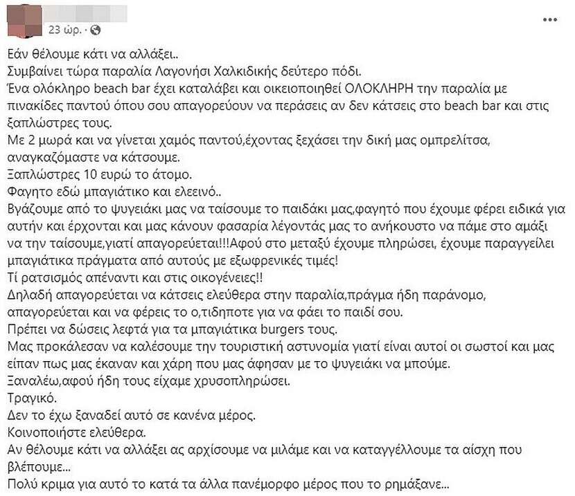Μια μητέρα έκανε σοβαρή καταγγελία στα μέσα κοινωνικής δικτύωσης σχετικά με περιστατικό που συνέβη σε beach bar της Χαλκιδικής.