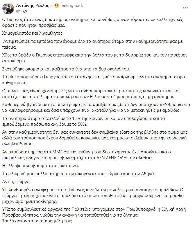 Ο σκηνοθέτης και ακτιβιστής Αντώνης Ρέλλας που είναι και ο ίδιος ΑμΕΑ προέβη σε μια ανάρτηση που τα είπε όλα για το θανατηφόρο δυστύχημα στην Βάρκιζα, από το οποίο σκοτώθηκε ο 40χρονος Γιώργος.