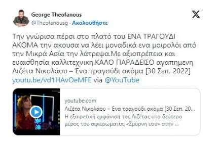 Ο Γιώργος Θεοφάνους θέλησε να την αποχαιρετήσει με τον δικό του τρόπο, γράφοντας δύο τρυφερά λόγια και ανεβάζοντας βίντεο από την τηλεοπτική αυτή εμφάνιση της Λιζέτας Νικολάου στην εκπομπή όπου συνυπήρξαν έστω για λίγο.
