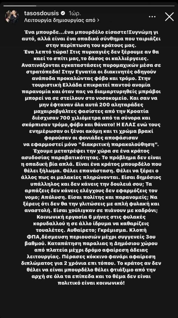 Ο Τάσος Δούσης για μία ακόμη φορά μίλησε έξω από τα δόντια, με αφορμή τα άγρια επεισόδια στη Νέα Φιλαδέλφεια, που είχαν ως τραγικό αποτέλεσμα τον θάνατο του 29χρονου Μιχάλη Κατσούρη! Ο Τάσος Δούσης, μέσα από την προσωπική του σελίδα στο Instagram, λέει τα πράγματα με το όνομά τους, σχετικό με το κράτος (ο Θεός να το κάνει) που μας κυβερνά.